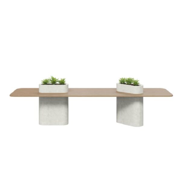 The Omie Breakout Table showcases a sleek, modern design with its asymmetrical obround legs. It tastefully incorporates natural elements through carefully placed plants, while the cement-look finish adds a touch of sophistication—making it an ideal choice for any professional setting.