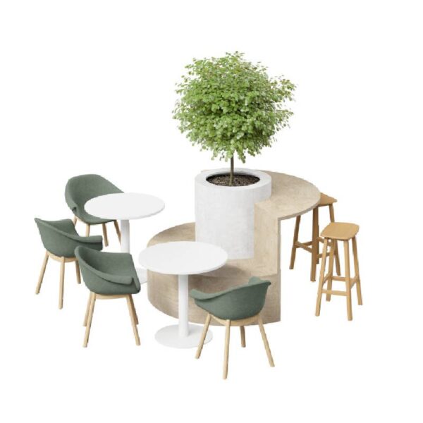 The Two-Tier Curved Planter Seat and Table is a hybrid breakout piece combining low and high bench seating. Its curved layout accommodates a large artificial tree at the center, creating a unique and functional space for relaxation and interaction.